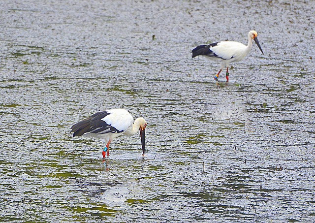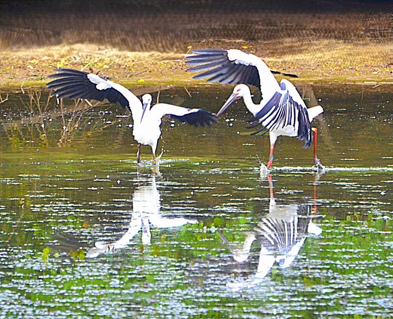 「あそぼ〜」とコウノトリがゴイサギへ近づいています。