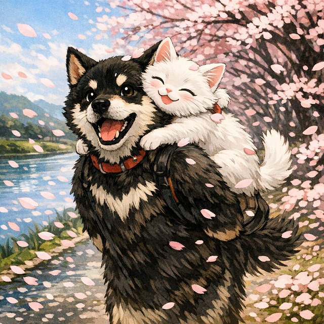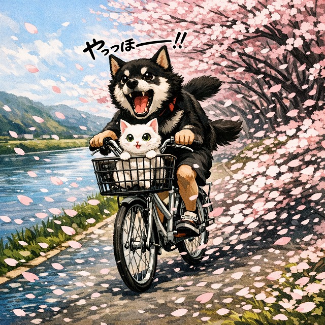タロウは元気に自転車に乗っています。途中で白猫の子どもに出会いました